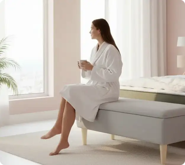 - В спальне банкетка Sarma станет уютным местом для утреннего кофе или вечернего чтения, а также практичным хранилищем для постельных принадлежностей.