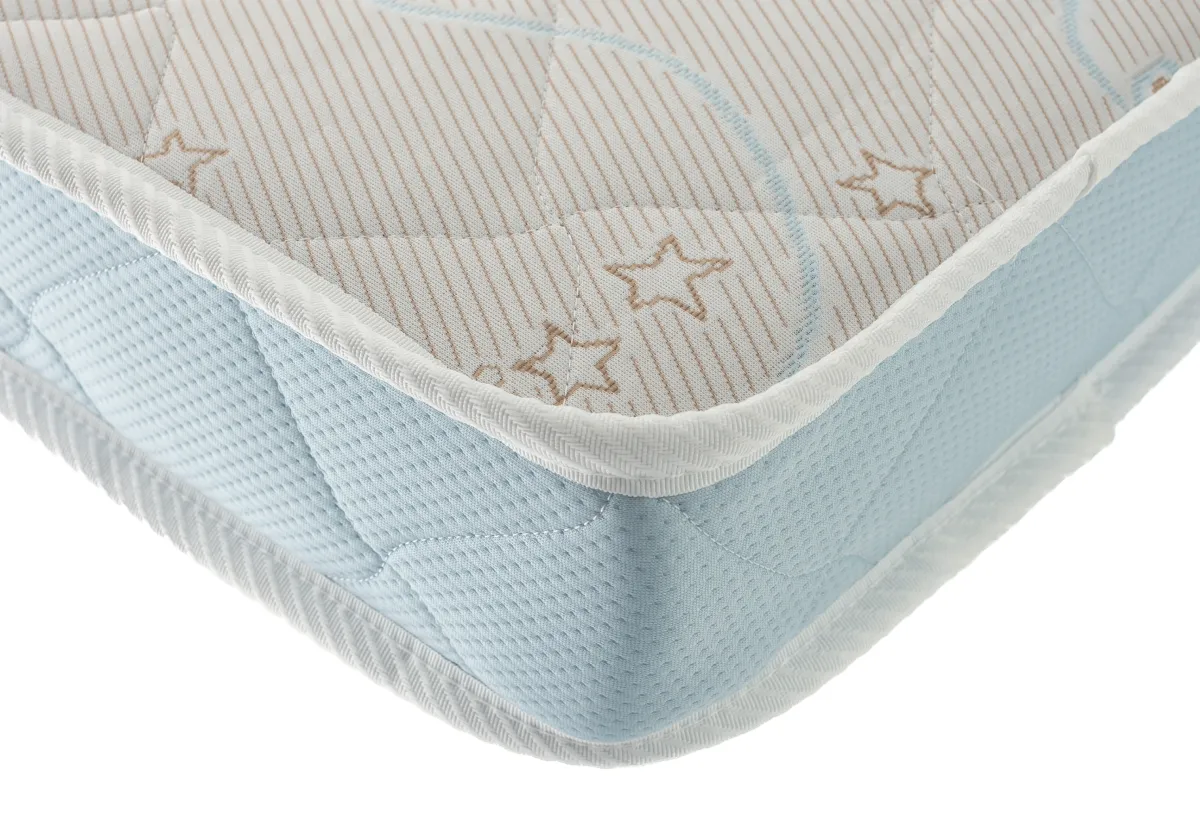 Матрас, в котором хочется спать и мечтатьЧехол из мягкого трикотажа с милым зайчиком, звёздами и нежными узорами превращает детскую кровать в уютный уголок для снов. Но это не только про красоту: внутри — два слоя био-кокоса по 10 мм, которые пропускают воздух и защищают от пыли, а система независимых пружин высотой 140 мм поддерживает спину ребёнка в любом положении. Технология ORTO 2.0 в чехле делает матрас ещё комфортнее — он адаптируется под тело, но не теряет форму. Высота 20 см и нагрузка до 120 кг означают, что он подойдёт и для малыша, и для подросшего ребёнка.